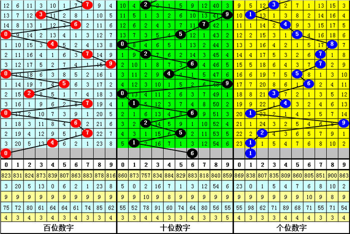 百位上期出现:温号4,该位连续十期以热号出现较多,以冷号出现较少,目前百位热号有5个:0、2、4、6、7,本期看好开出热号再次出现,参考号码0。