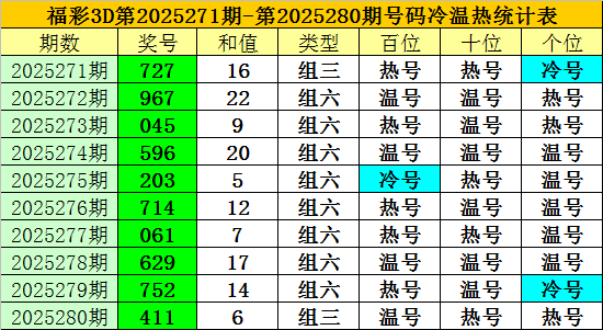 上期回顾:福彩3D第2025280期开奖奖号为:411,奖号类型为:组三,奖号冷温热态为:温号+热号+热号。